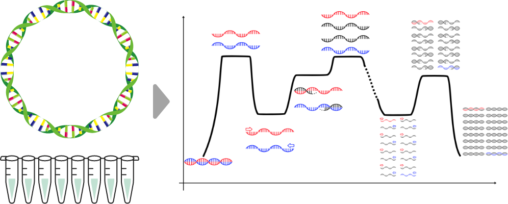 また、ある種の複製開始点配列をプラスミドに挿入することで、試験管内でそのようなプラスミドの増幅をかけることもできる。しかし、複製開始点配列をプラスミドに挿入する手間が必要なことに加え、大量調製には多額の費用がかかるという問題点がある。
